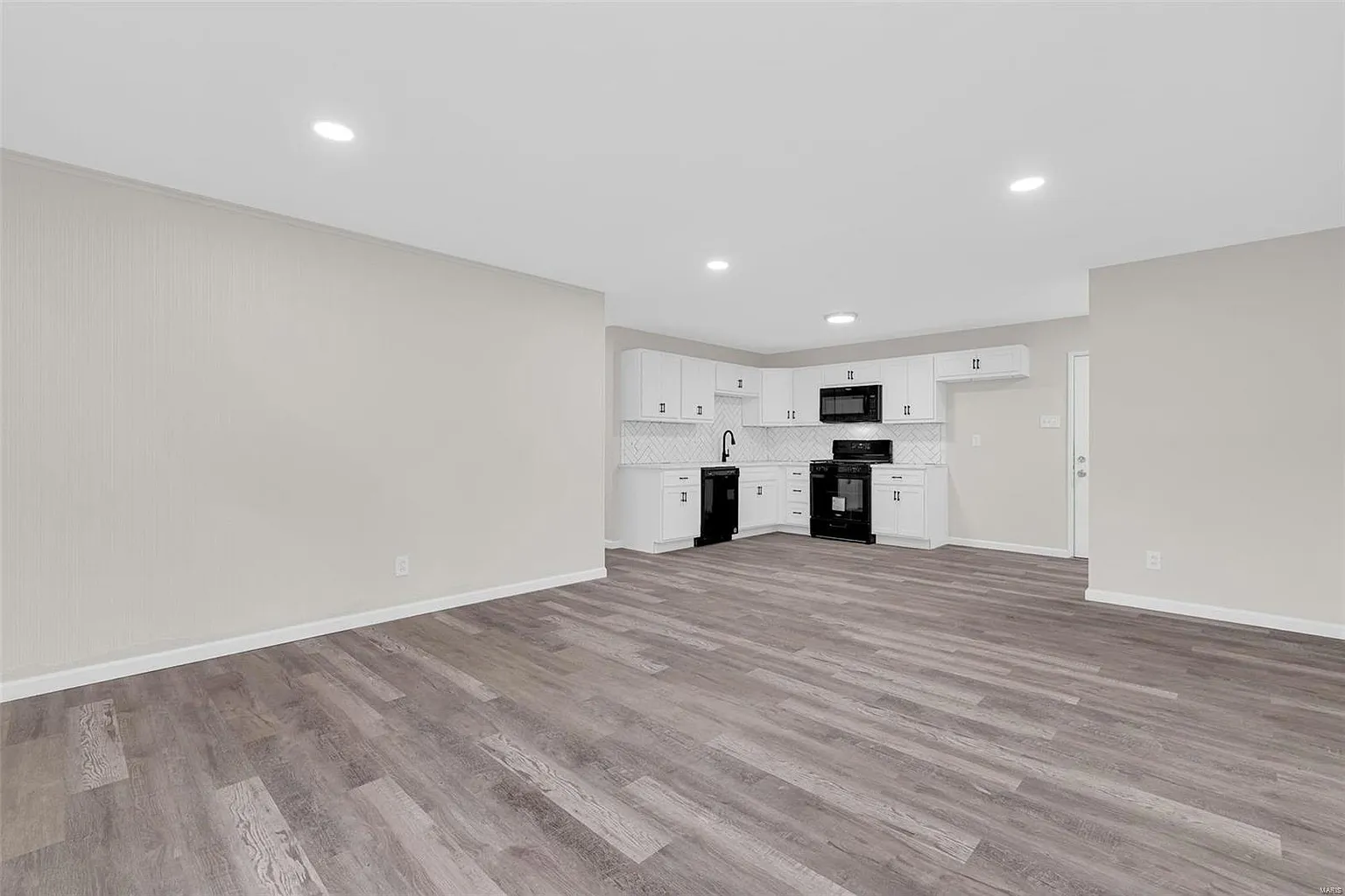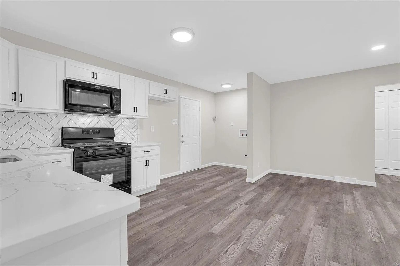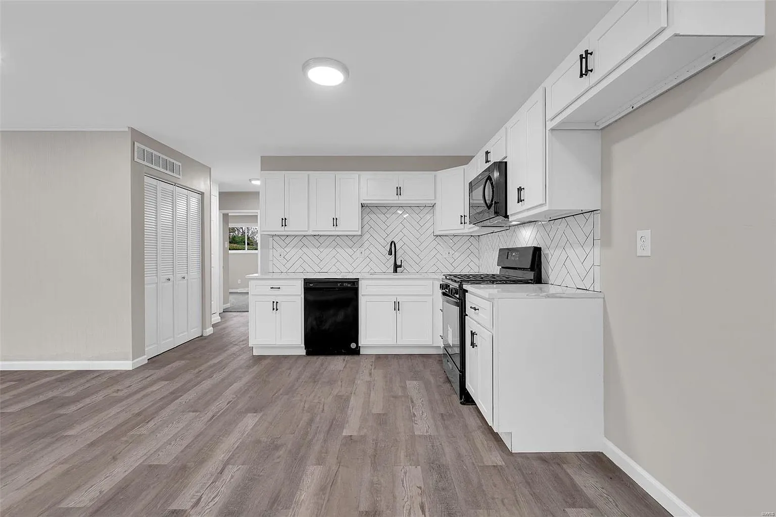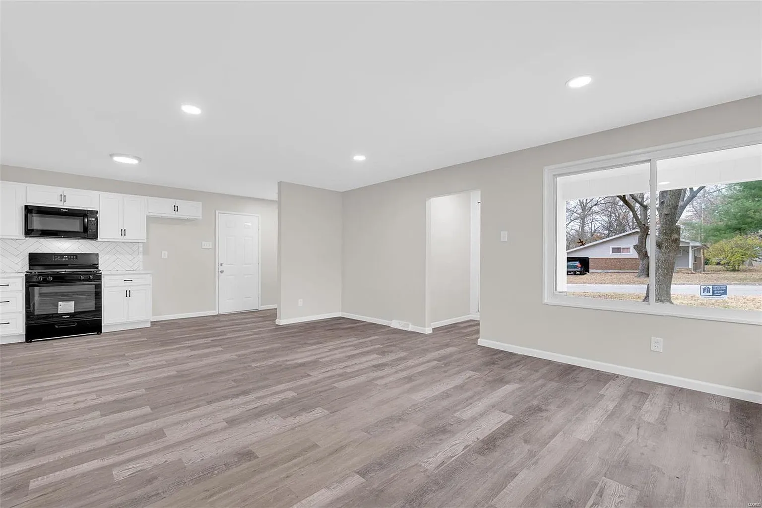 Inside, the bright living room welcomes natural light through large windows that highlight new luxury vinyl flooring, fresh paint, and updated trim. Next, the open layout flows into a stylish kitchen and dining area with granite countertops, new cabinetry, wall tile, and brand-new appliances.